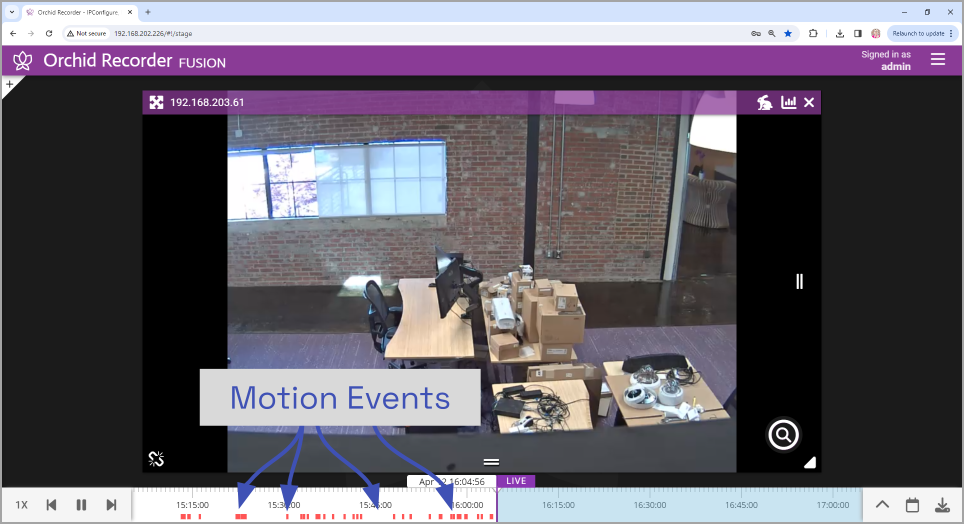 A motion event will occur when the system detects movement in the video (using either camera-based motion detection or server-based motion detection). When this happens, the software marks the event on the Timeline Bar with a red bar. This bar will remain on the Timeline Bar as long as the motion continues.