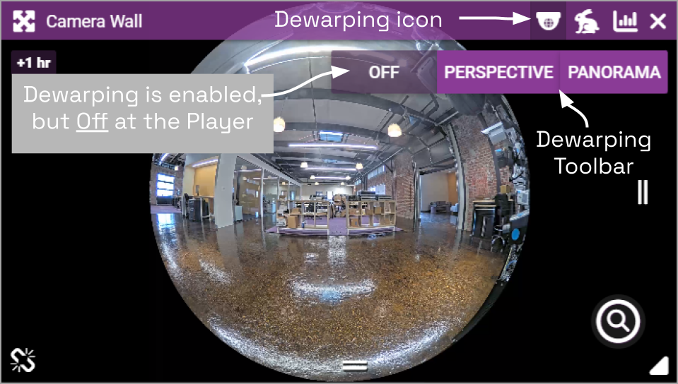 - To view the camera in its native fisheye format, click the OFF button on the Dewarping toolbar (as in the image above).