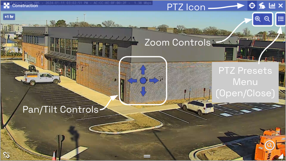 - Click on the PTZ icon in the header. (This icon will only be available if the camera supports pan-tilt-zoom.) This will activate the camera’s PTZ controls which will appear as an overlay on the Player. This will also activate the PTZ Presets Menu (if the camera supports presets).