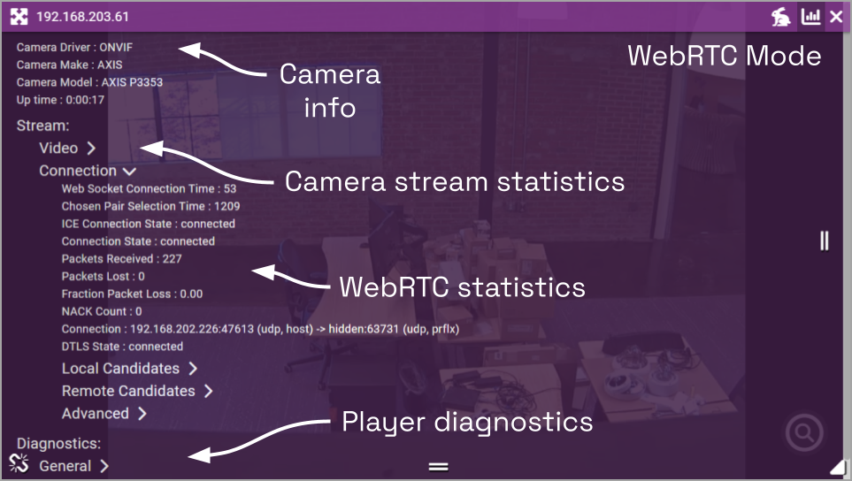 If you’re running Orchid Recorder in WebRTC mode, in addition to providing details pertaining to the camera and video quality, the software will display a wealth of other statistics. (For more details, please refer to the Orchid Recorder Administrator Guide.)