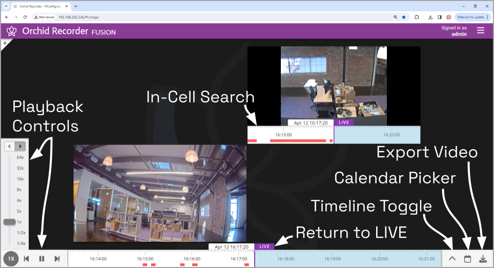 The Stage screen provides various options for viewing live and recorded video. These options, along with the availability of the Timeline Bar and the adjacent tools will vary depending on the permissions of the signed-in user.