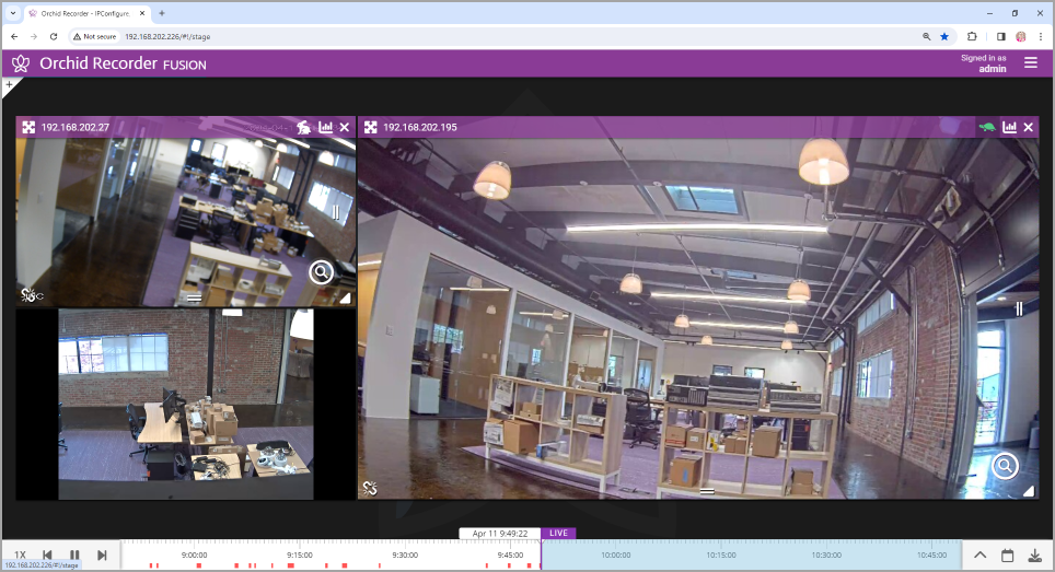 The Orchid Recorder Stage is intended to be a very flexible workspace and can be rearranged as your needs change. You can add and remove Players from the Stage at any time and position them as you see fit. And remember, as long as the cameras are configured to record, the system will acquire and store video footage even when the Players are not on the Stage.