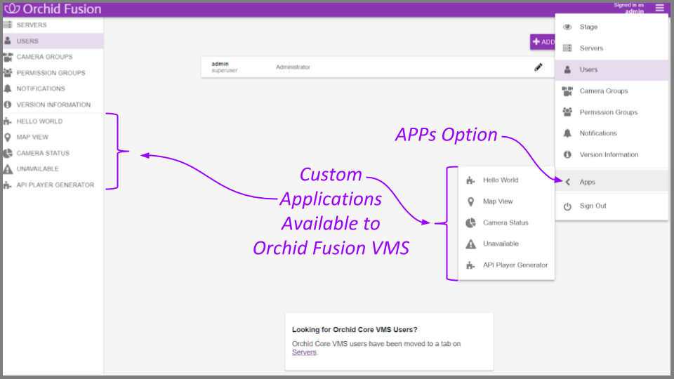 - The APPs sub-menu will appear. This sub-menu will list all of the custom applications that Orchid Fusion VMS finds in the location noted in the Fusion properties file. (Notice that all of your custom applications are now also listed on the Configuration Menu, when visible, on the left side of the screen.)