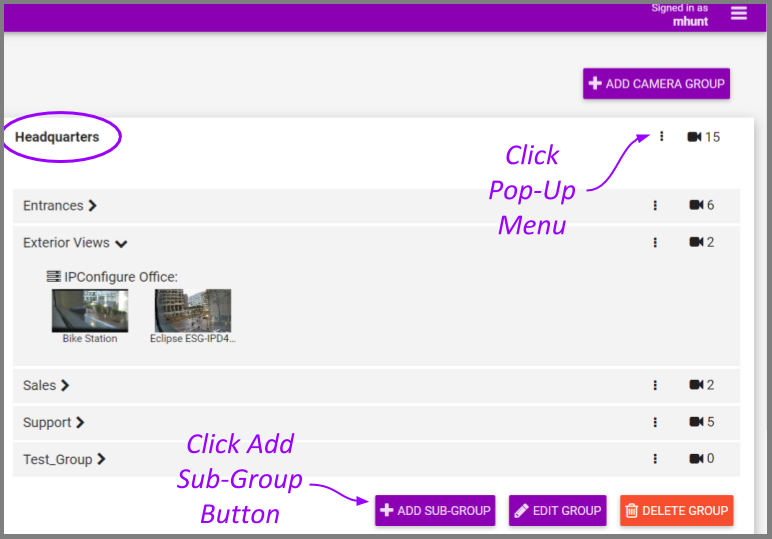 - Click the pop-up menu to the right of the Camera Group name and select Add Sub-Group.