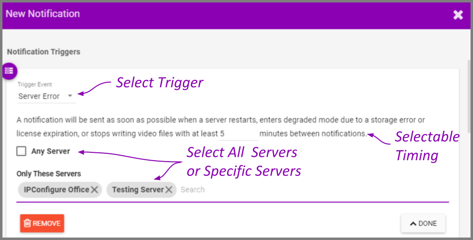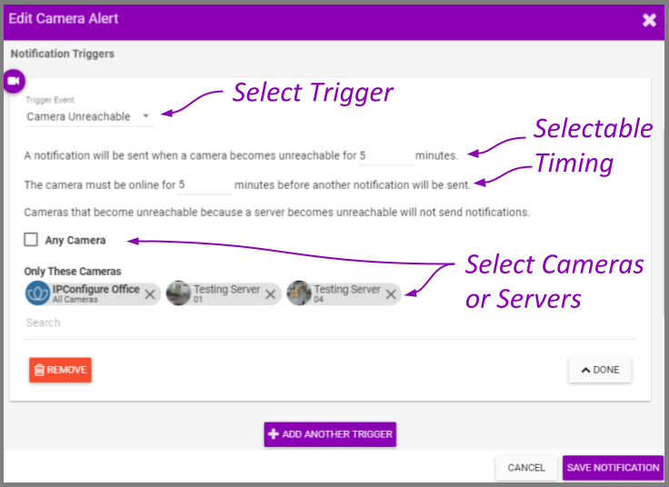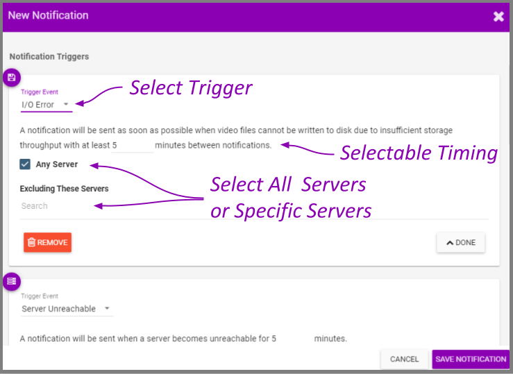 In the Notification Triggers section, you may select one or more events that may initiate a Notification. (Notice that by default, the New Notification dialog includes a Camera Unreachable trigger, a Server Unreachable trigger, and a Server Error trigger. Scroll down to view all of these and remove any triggers that you don’t wish to use.)
