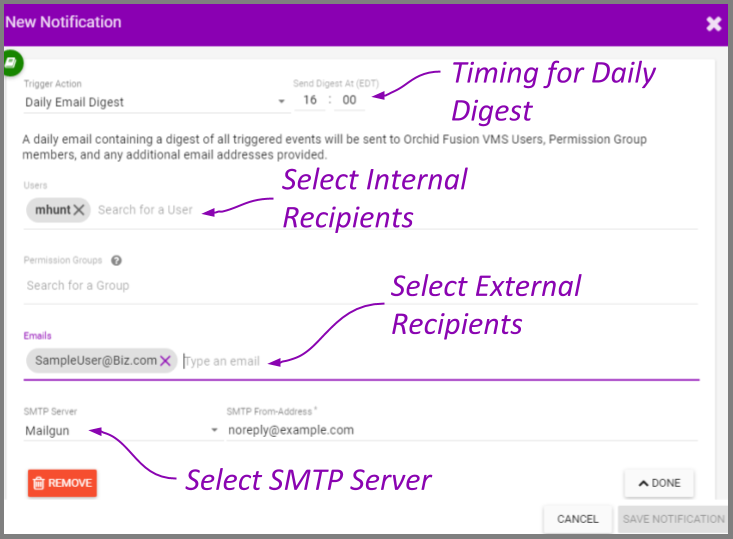 - If you select Daily Email Digest, use the Send Digest At field to define the send time for the daily alert.