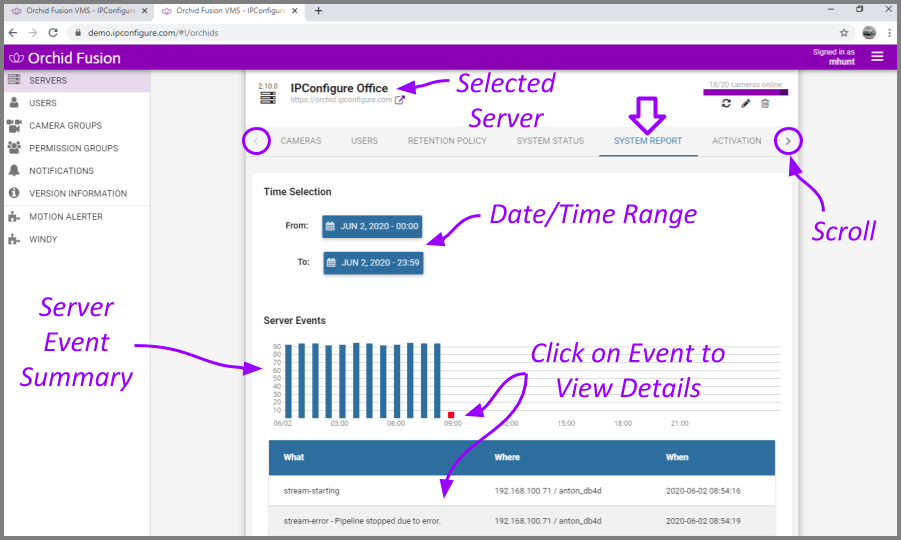The System Report tab allows Administrators to view various types of events (such as camera streams starting and stopping) and camera stream statistics during a specified time period. This report also provides access to the Orchid Core VMS system log.