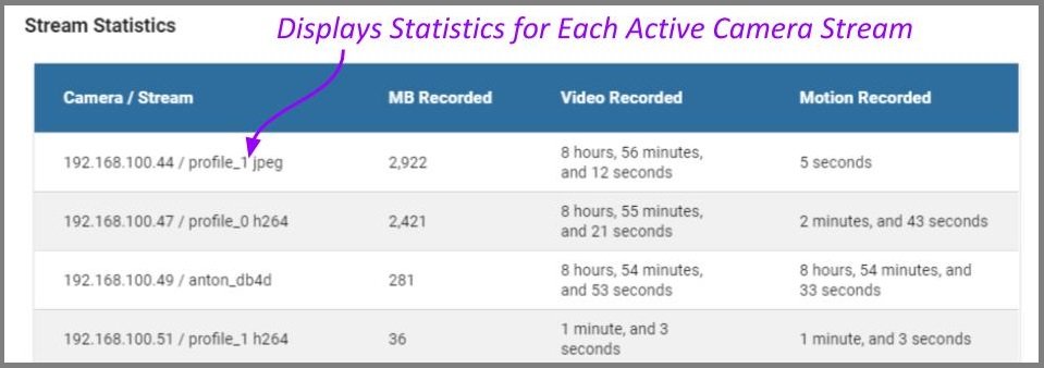 The Stream Statistics section lists each of the active camera streams in Orchid Core VMS. For each stream, Orchid Core VMS will show how many megabytes of video was recorded, the length of the recorded video, and how much of the recorded video contained motion.