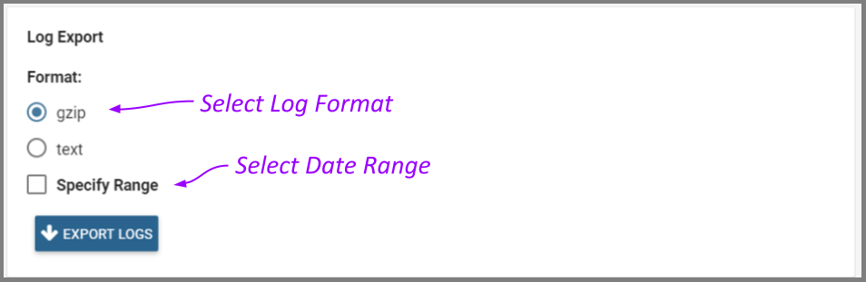 - text: This option will display the log within the browser without downloading any files. This file is likely to be very large when a narrow date range is not specified.