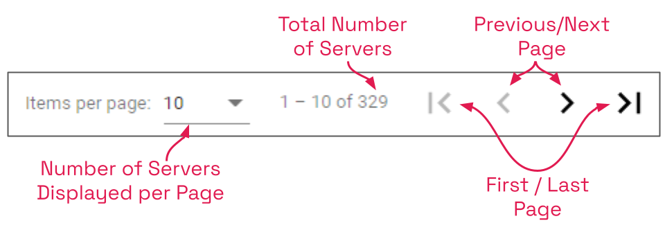 - Use the Items per page drop-down list to set the number of servers you want to view per screen. Available selections include 10, 20, and 50.