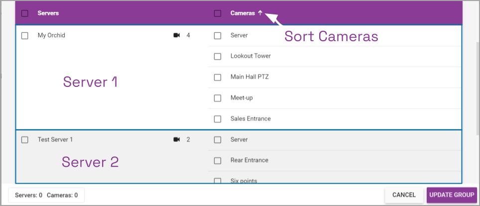 - You have the option to select all of the listed servers (with all of the cameras) for the group.