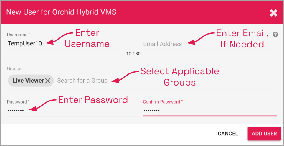 - Click the Add User button at the bottom of the screen to create the new Orchid Fusion/Hybrid VMS user.