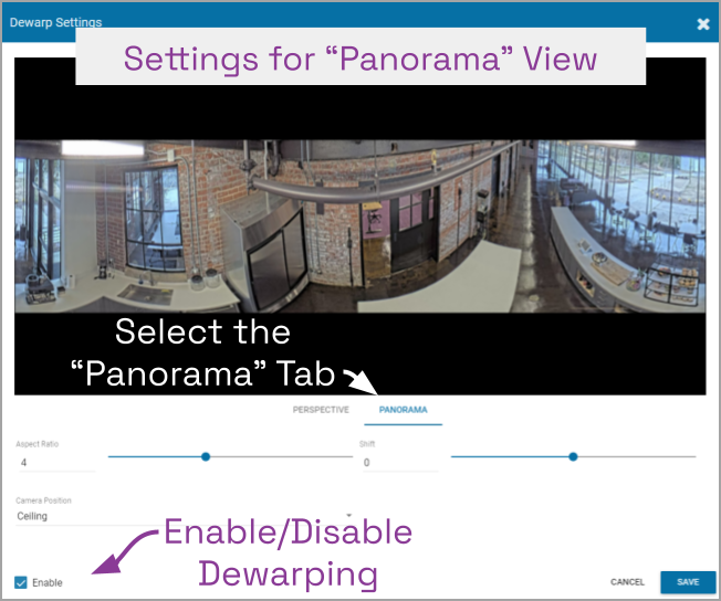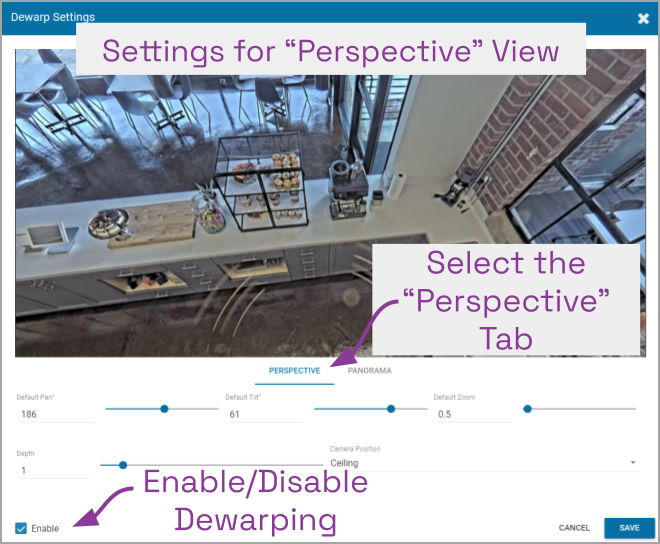 - Mark the Enable checkbox to activate the Dewarp Settings (both Perspective and Panorama ) for this camera. (If this is not marked, Dewarping features will not be available at the Player.)