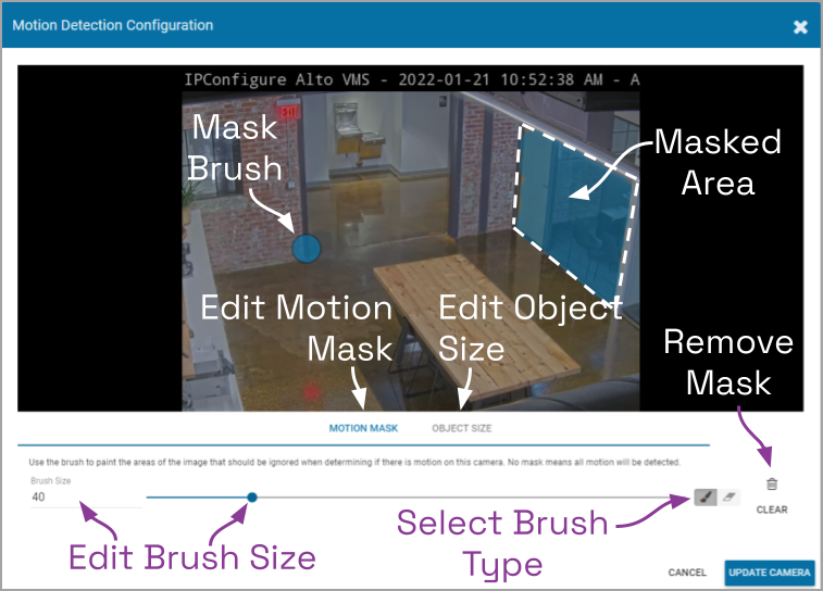 - The paint brush will add a masked area to the video image. This area will be ignored by the motion detection feature.