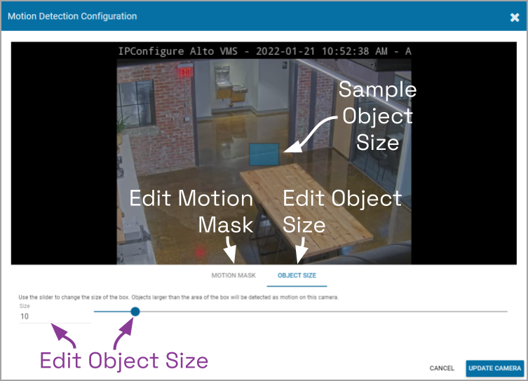 - To save the Object Size settings, click the Update Camera button.