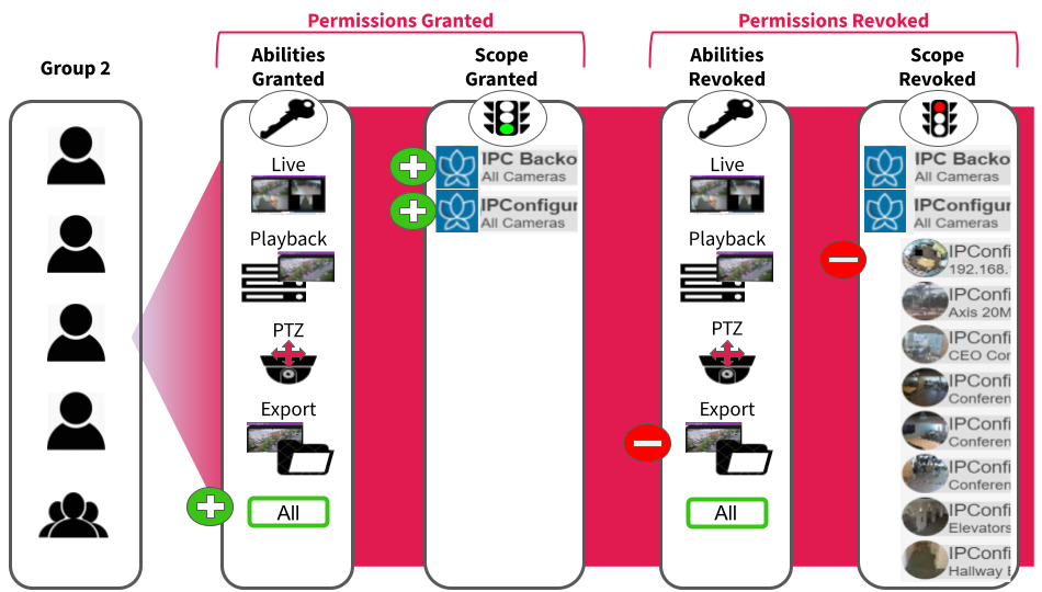 The next diagram shows a more complex example (but it’s still easy to set up in Orchid Fusion/Hybrid VMS). With one permission set, all of the abilities are granted to the Permission Group and these abilities are extended to two Orchid Core VMS servers (All Servers/All Cameras). But in this example, there needs to be one exception. To do that, another permission set is created to revoke permissions on one ability on one camera.