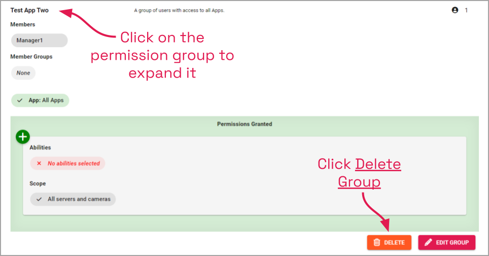 - To delete the Permission Group, click the Delete button at the bottom of the expanded entry.