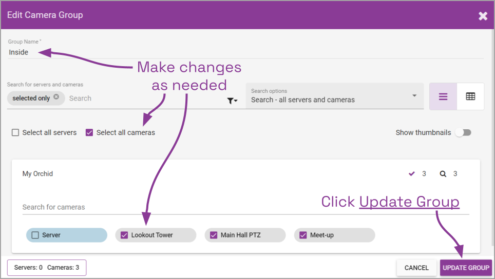 You can rename or change the cameras in a Camera Group at any time. You will use very similar processes to edit a top-level Camera Group and a Sub-Group.
