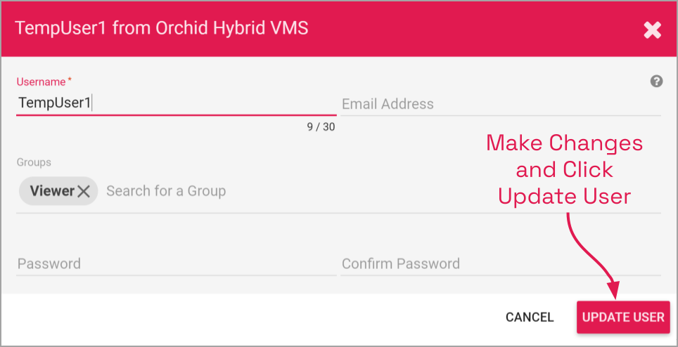 Nothing is set in stone for Orchid Fusion/Hybrid VMS users and almost all of the user settings can be updated, as needed. The only user that cannot be completely edited is the default admin user. While the password can be updated, the username cannot be changed.