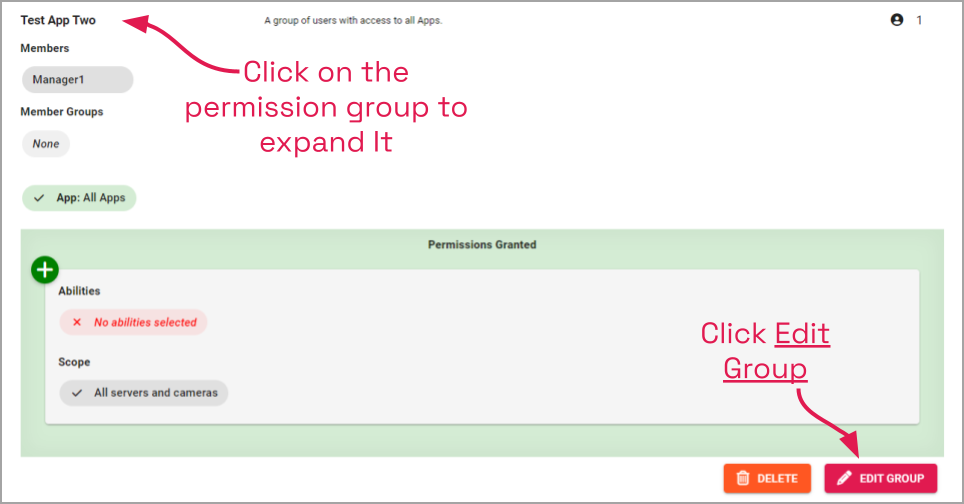- To edit the Permission Group, click the Edit Group button at the bottom of the expanded entry. The Edit Group screen will open.
