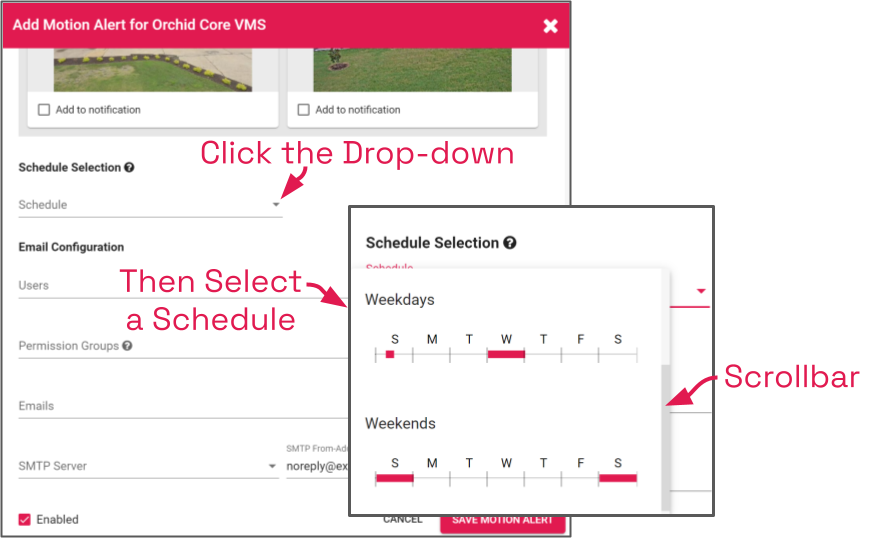 - Next, use the Schedule Selection drop-down list to select the desired monitoring period. (If the schedules have not been configured yet, you may come back to this later. Keep in mind, though, that until the schedule is selected, no Motion Alerts will be sent.)