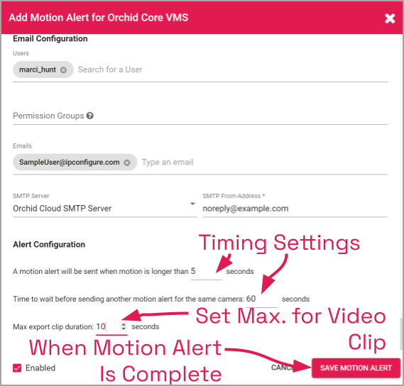 The example below shows an Orchid server that has a Motion Alert that is enabled and properly configured.