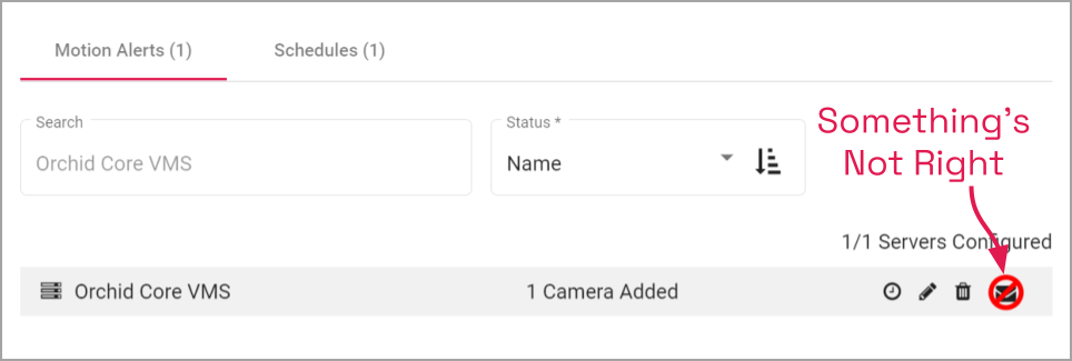 The example below shows an Orchid server that has a Motion Alert, but it has an error. (In this case, no SMTP server was selected.)