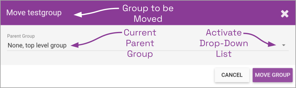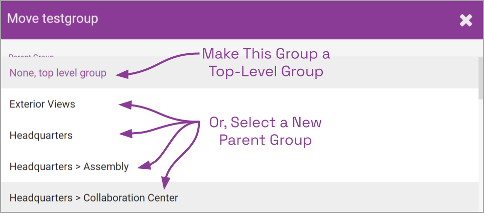 - To make a move, click the Parent Group drop-down list to see available selections.
