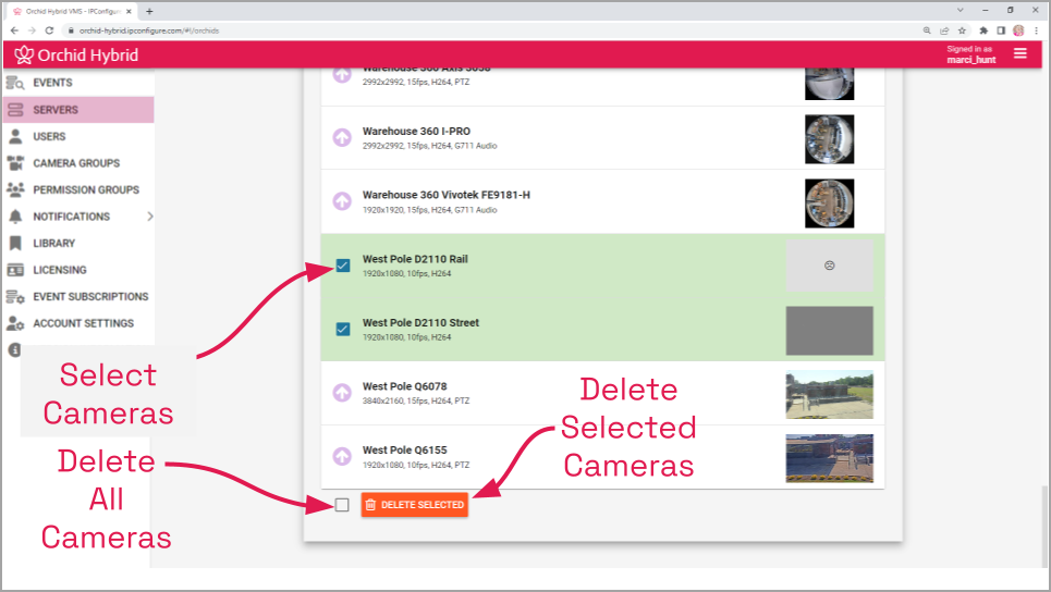 Multiple cameras can be removed from Orchid Core VMS at the same time, if needed.