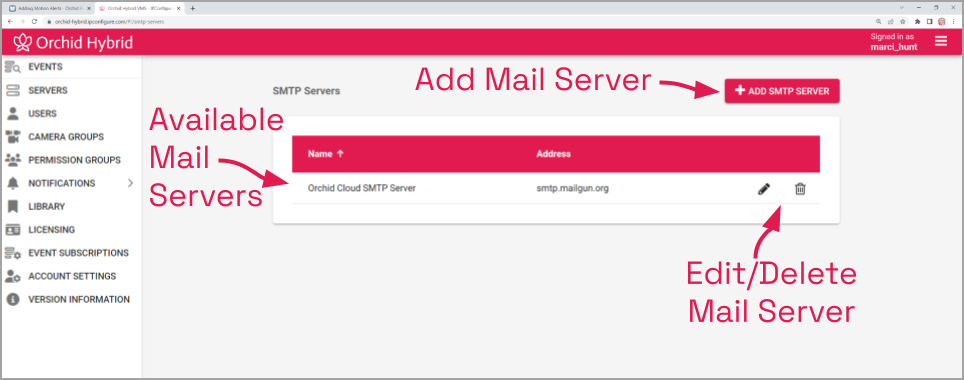 The Orchid Fusion/Hybrid VMS SMTP Servers screen will appear. This screen displays a list of all the current SMTP Servers, and gives you the ability to add, edit, and delete them.