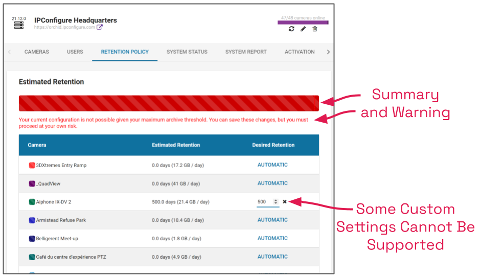- To edit the minimum Desired Retention setting for any given camera, click on the corresponding Automatic button.