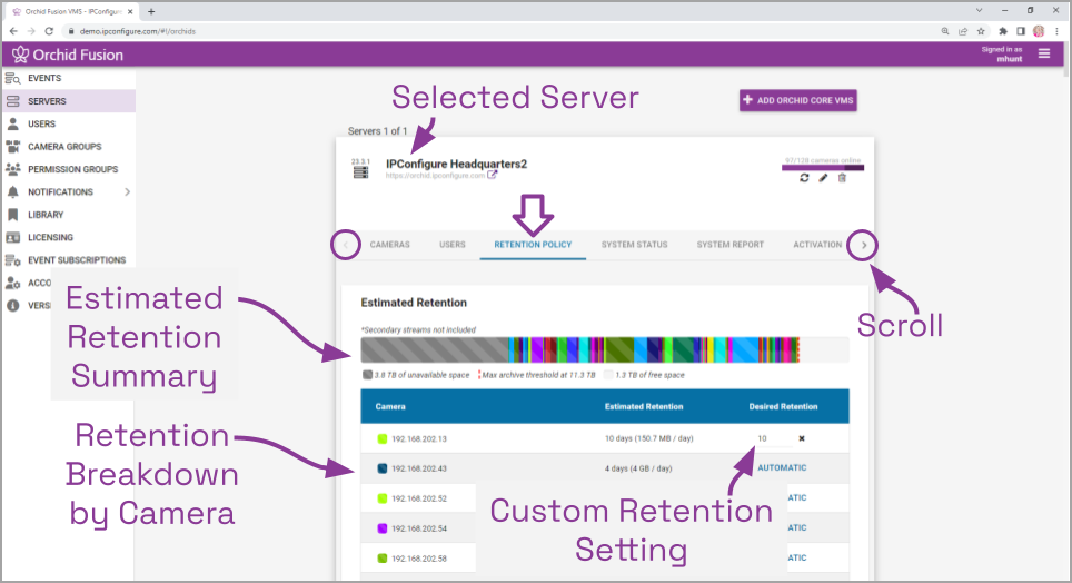 The Retention Policy feature in Orchid Core VMS allows Administrators to manage video archive retention on a stream by stream basis as well as review current and projected disk utilization.