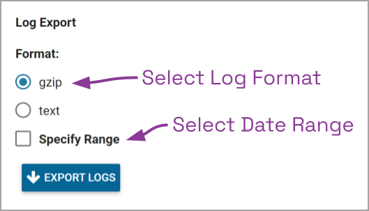 - text: This option will display the log within the browser without downloading any files. This file is likely to be very large when a narrow date range is not specified.