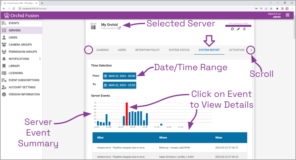 The System Report tab allows Administrators to view various types of events (such as camera streams starting and stopping) and camera stream statistics during a specified time period. This report also provides access to the Orchid Core VMS system log.