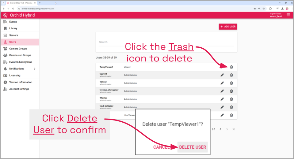 - To delete an existing user, click the Trash Can icon to the right of the username.
