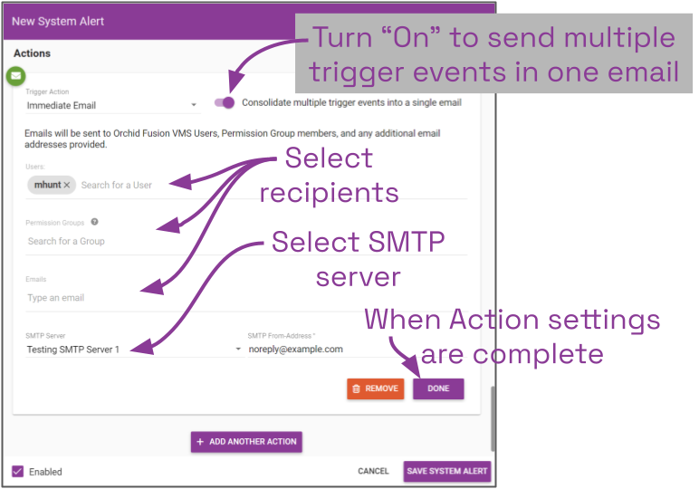 If you select Immediate Email, a System Alert will be sent each time a valid trigger event occurs. Beginning in version 23.9, the Immediate Email action will include an additional option that allows you to send separate alerts for each individual trigger event.