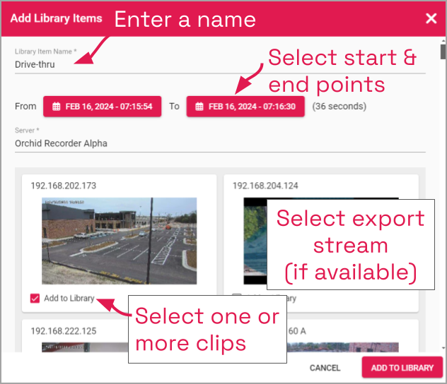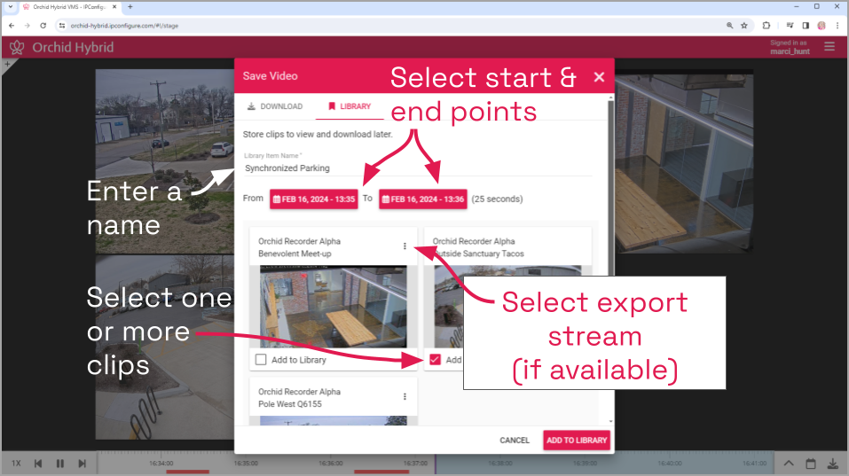 If you want to add an item to the Library from the Stage, you’ll need to start by using the Export feature. While the export feature typically saves files to the client system hard drive, with the addition of the Library, users will have the option to export video to the Orchid Hybrid/Fusion VMS server hard drive (or to an external cloud storage service, if configured).