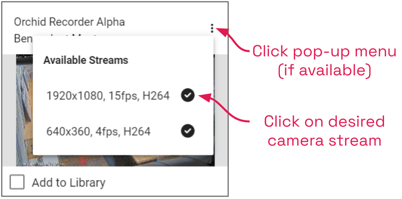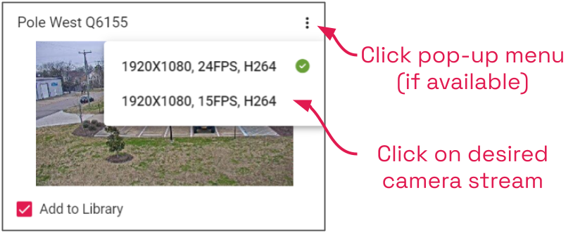 For some Players, you may also see a pop-up menu (to the right of the camera name). This menu allows you to select which of the camera streams you want to select for the export. (This menu will only be available if multiple recording streams have been configured by the Administrator. If you don’t select anything, the system will export the highest resolution stream by default.)