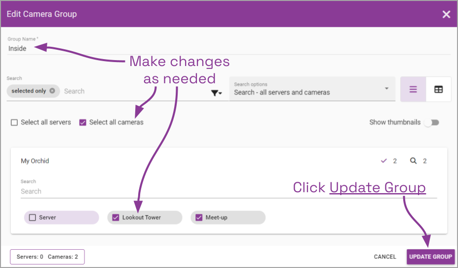 You can rename or change the cameras in a Camera Group at any time. You will use very similar processes to edit a top-level Camera Group and a Sub-Group.
