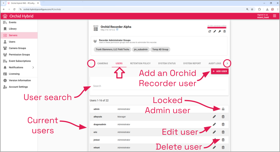 The Users tab allows Administrators to manage users registered to the selected Orchid Recorder. Each Orchid Recorder is configured with one administrator user by default; this user is created during installation and cannot be removed. Additional users may be created with varying levels of access (determined by each user’s role).