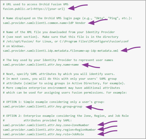 There are several properties related to SAML authentication that will need to be added to the Orchid Fusion VMS configuration file. So as a first step, get the configuration file ready for these new settings. You won’t be able to fully configure the last three properties until you have configured your Identity Provider (IdP) (which will be explained later).