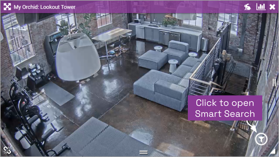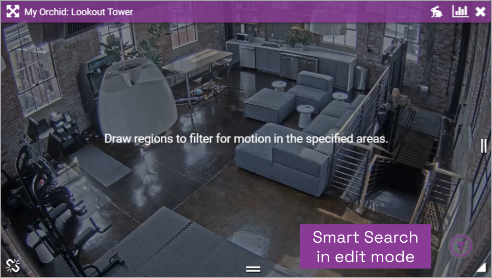 Beginning in version 22.12, Orchid Fusion VMS supports the new Smart Search feature. This feature allows you to select one or more specific areas of a Player to monitor for motion. These targeted motion events will appear in purple at the top of the Timeline Bar so they are easy to identify.
