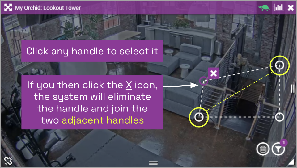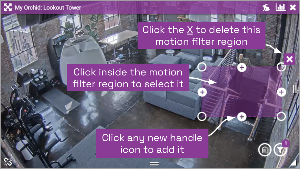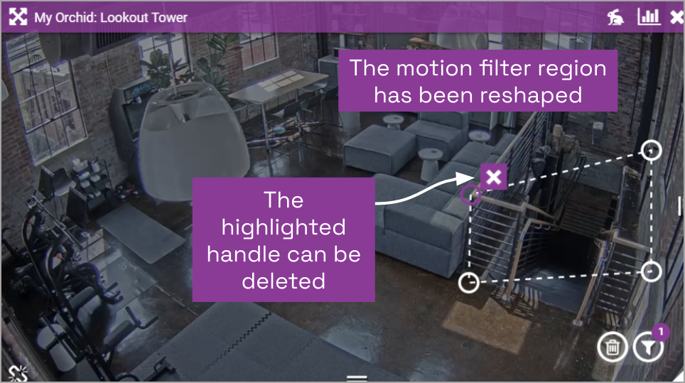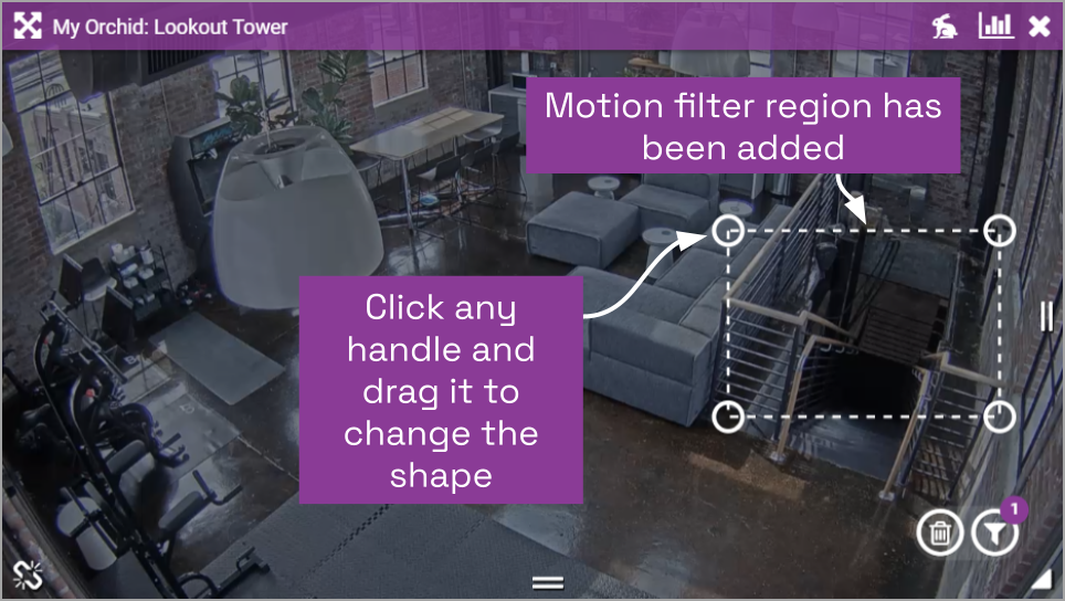 Beginning in version 23.3, Orchid Fusion VMS allows you to modify the initial motion filter region rectangle, so you can create a custom shape. Notice the circular handles at each corner of the rectangle? These may be used to change the shape of the motion filter region. You even have the ability to add and remove handles.