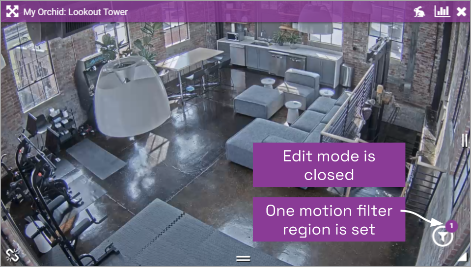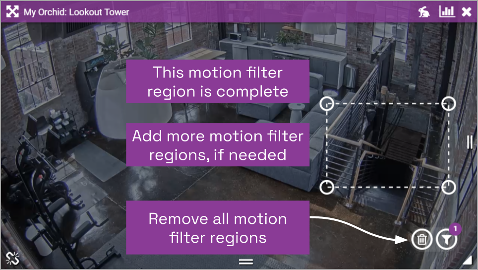 - When you are done adding motion filter regions, click on the Smart Search icon to close editing mode. The Smart Search icon will return to white and will indicate how many motion filter regions have been set up (if any).