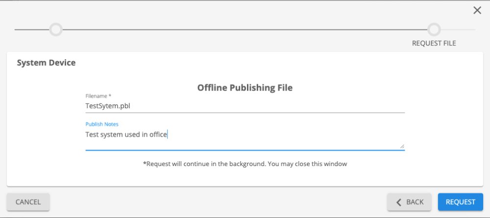 Offline Publishing files are used to publish Brains that are not connected to WAN. This files can be generated within the Builder and/or Manager. This article covers the process of requesting and downloading Publishing files from the Kramer Control Manager.