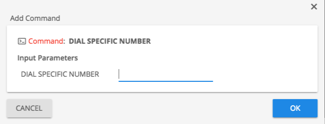 This option dials a full number. Adding this command to a widget will prompt a popup window asking the programmer to input the number. This command would be used in a directory/phone book scenario.