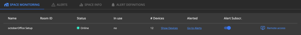 The Space Monitoring tab shows new information for Brain status, Room in use, and Alert subscription