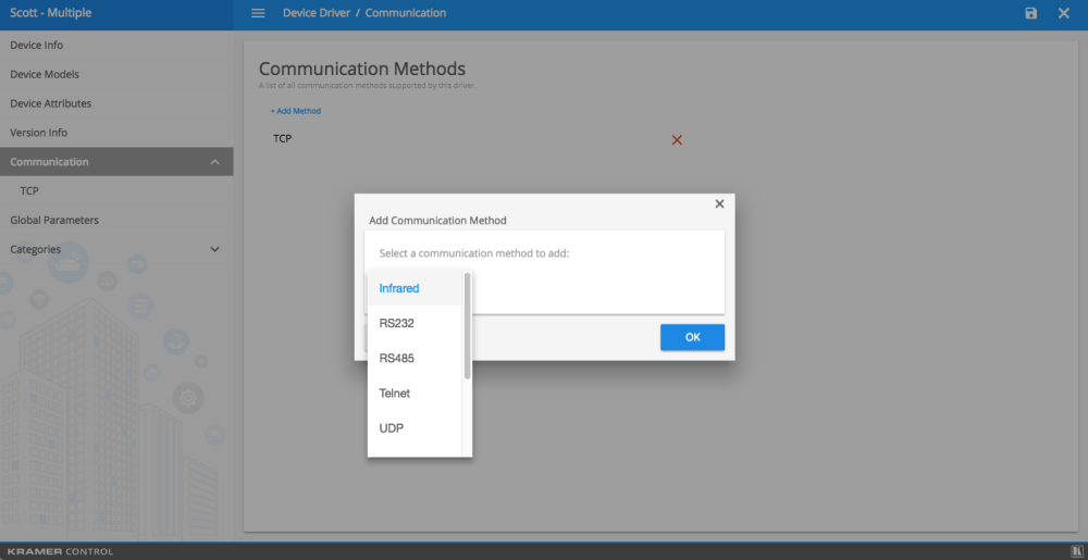 IR是最基本的控制方法。IR要求将发射器连接到受控设备的IR接收位置。红外控制是一种方法,这意味着无法从本机接收到任何反馈。*注释* 构建器 IR设备是使用“虚拟状态”的好时机::https://www.manula.com/manuals/kramer/kramer-control/1/zc/topic/device-attributes