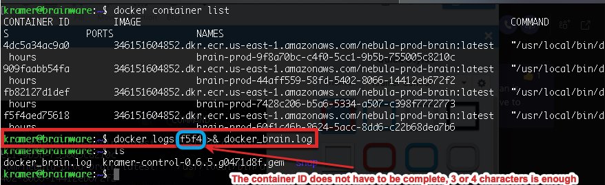 Downloading logs from KC-Brainware server Brains is currently different from SL Brains. In order to download logs from the docker brains, you will need to download the container logs directly from the docker service