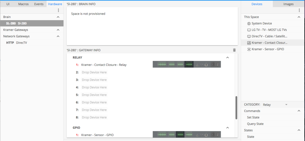 如果将中继/gpio布线连接到大脑硬件,则将Kramer设备拖到大脑硬件屏幕内的任何端口。由于命令指示要控制哪个端口,因此只有一个设备要添加到网关。